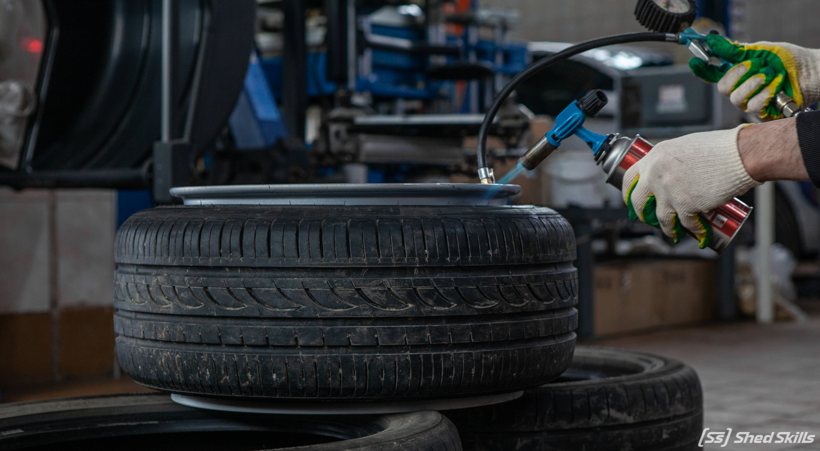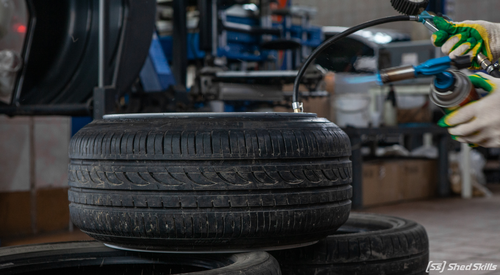 Расскажем подробнее, как резина на колесе вдруг становится «домиком». Внутрь покрышки помещается небольшое летучее горючее вещество, одновременно с подносом к колесу горелки в колесо поступает воздух, чтобы процесс горения протекал эффективнее и давление было выше.