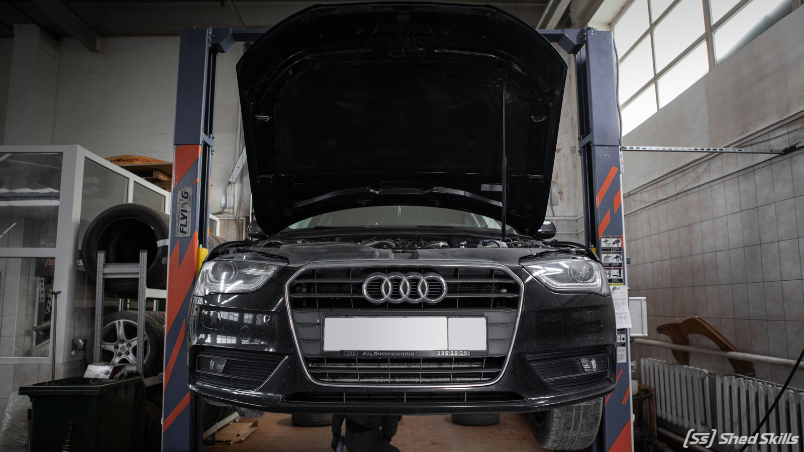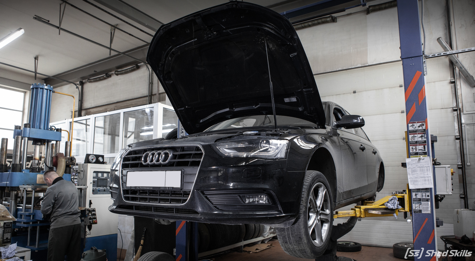 Автомобиль Audi A4 на техническом обслуживании. В список работ входит: Замена масла в двигателе, замена фильтров, замена тормозных дисков (т.к. при торможении ощущается биение в руль), замена тормозных колодок (рекомендуется не позже, чем каждые 15 000 км пробега), замена сайлентблоков нижних рычагов передней подвески (после зимнего периода у множества автомобилей появляется стук при проезде неровностей, при диагностике подвески были выявлены дефекты резинометаллической детали.