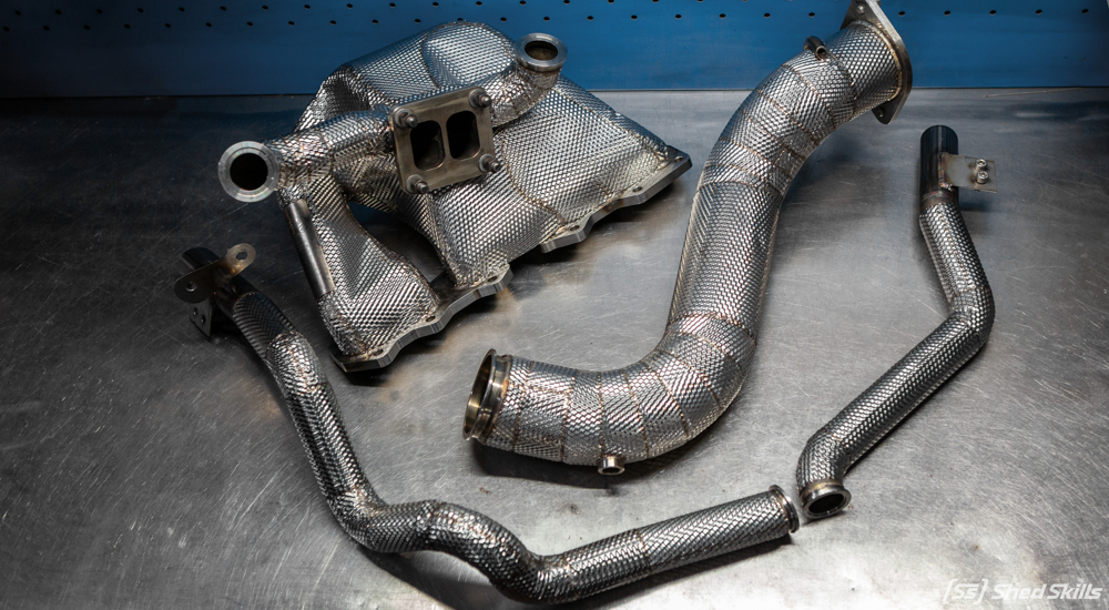 Далее начинаем обвешивать двигатель деталями и приводить подкапотное пространство в законченный вид. Делаем впуск, ставим коллектор, который предварительно термоизолируем, делаем даунпайп с выхлопной системой. Изготавливаем систему охлаждения, и прокладываем проводку с электроникой!