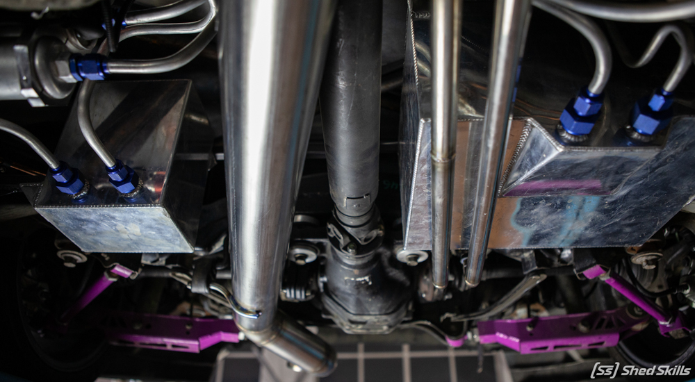 На задней оси ставим дополнительные суппорты гидроручника (от Mercedes E-class W124), которые установлены с помощью пластин ShedSkills. Спереди и сзади с помощью проставок ShedSkills установлены суппорты UCF 30, проложены все тормозные магистрали. Изготовлена и установлена топливная система, алюминиевые баки варим сами, готовим гидролинию сцепления!