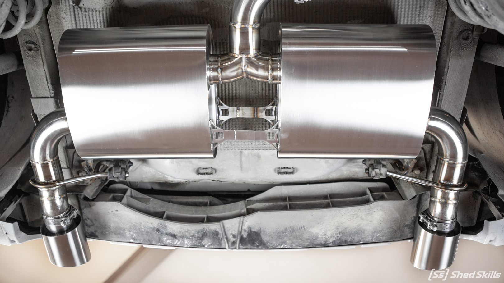Как мы отметили в предыдущем посте, заслонки на данном авто неэффективны, а именно: громкий режим будет громким, но тихий также останется слишком громким для комфортной езды по городу, поэтому наше решение (в соответствии с пожеланиями заказчика) - сменная центральная часть cat-back'а, выполненная в двух вариантах: Sport и Street.